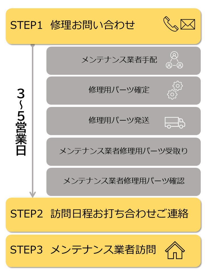 修理に必要なパーツの手配がございますので、ご依頼日から3~5営業日でメンテナンス業者よりご連絡を差し上げます。