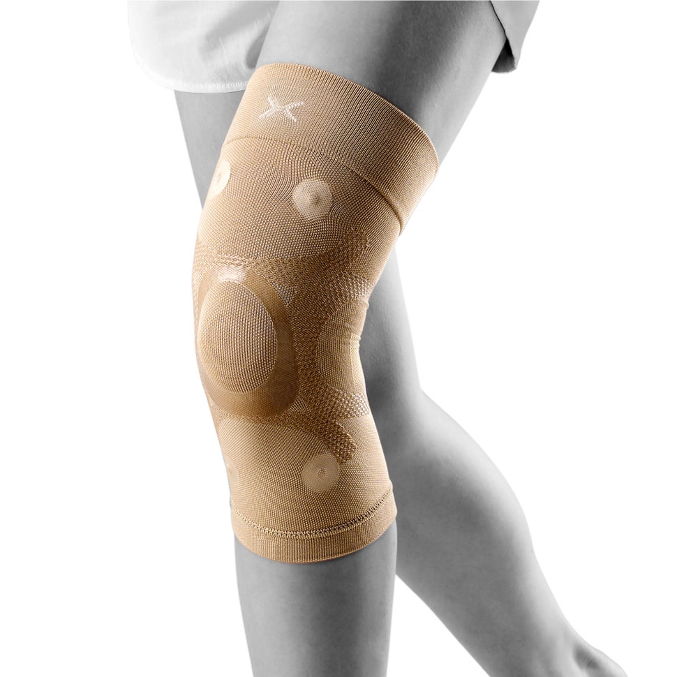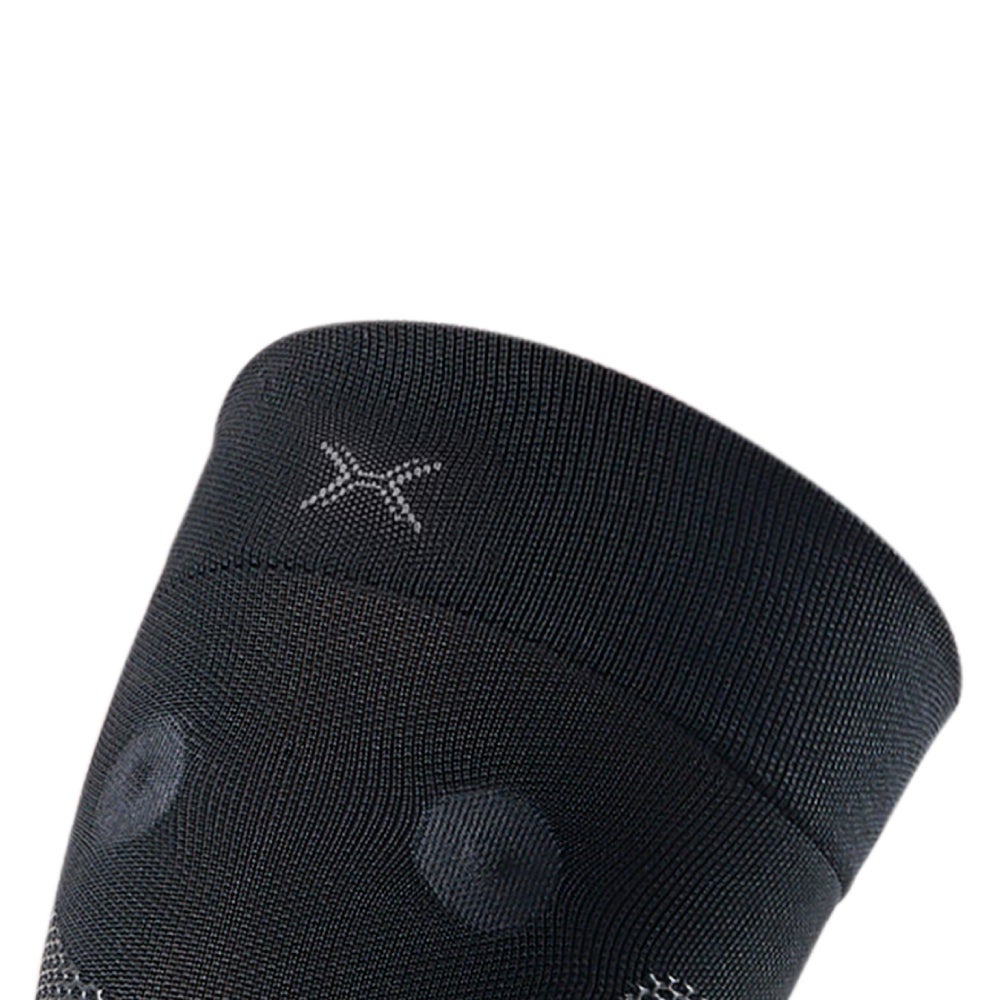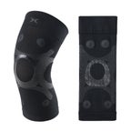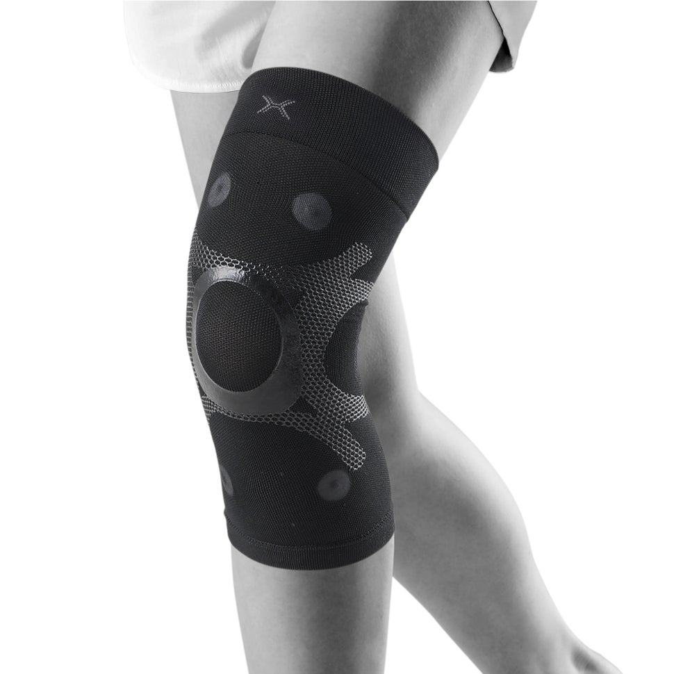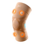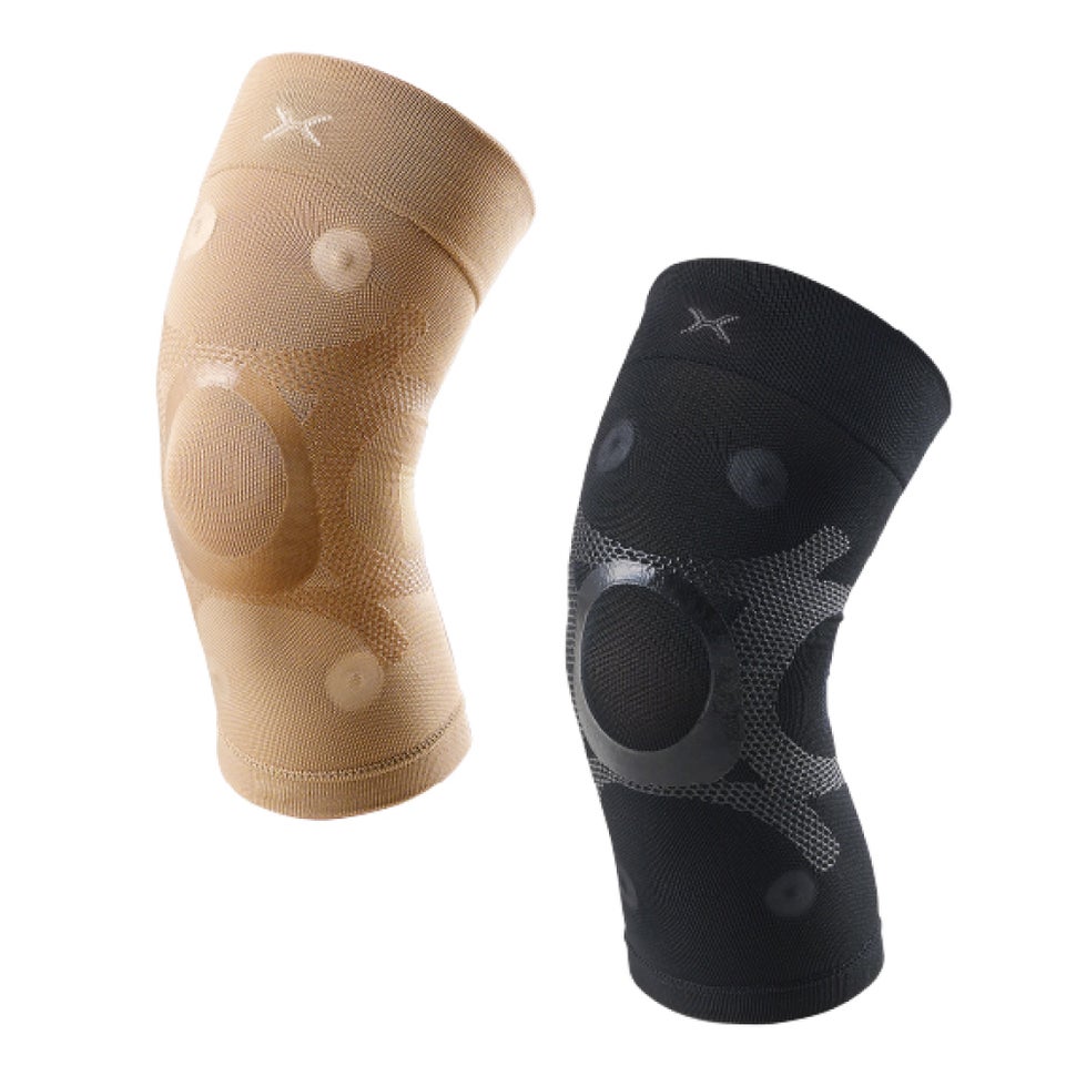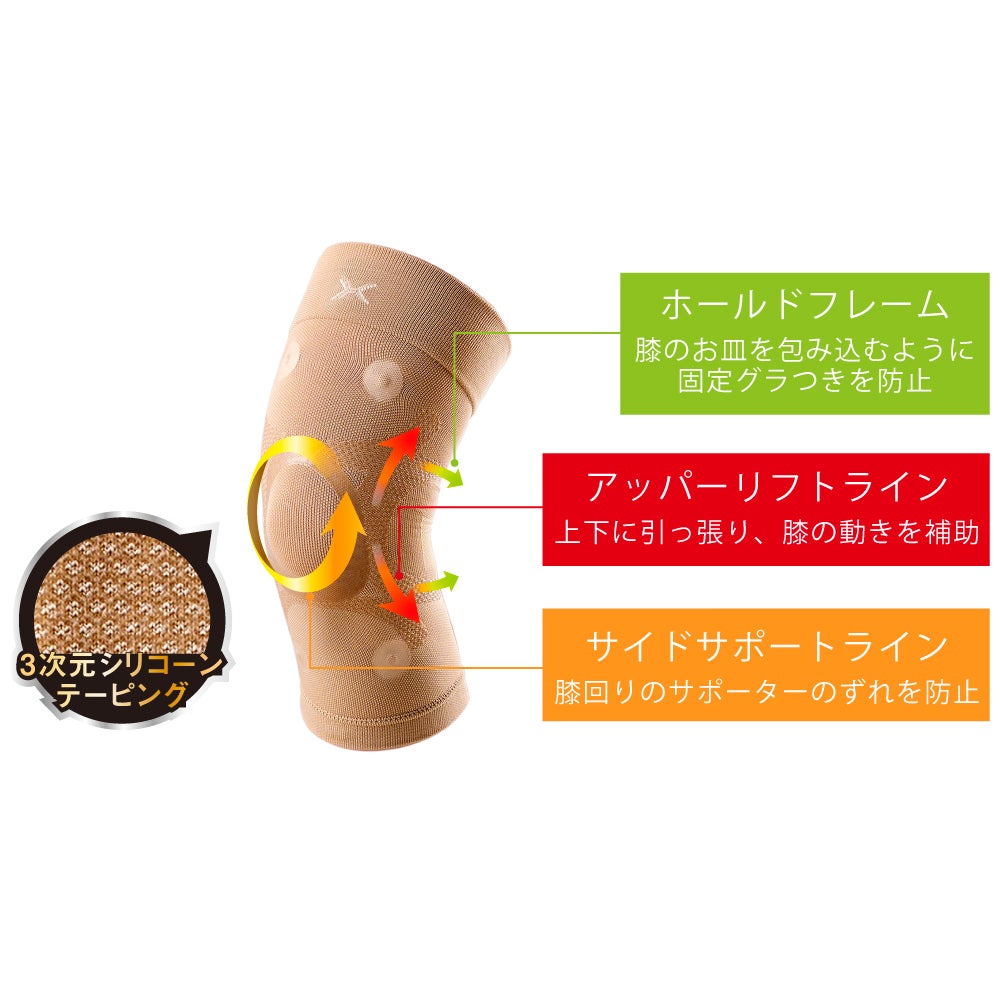 サポーターの膝周りにある4つの磁石が、筋肉の血流をよくしてコリや疲労の悪循環にアプローチします。液状シリコーンをニット編み目へ立体的に浸透・形成する3次元シリコーンテーピングで筋肉や関節機能の働きを補助。塗布部は肌へ密着しテーピングのように効き、非塗布部は生地の伸縮を保ち可動域を確保します。
