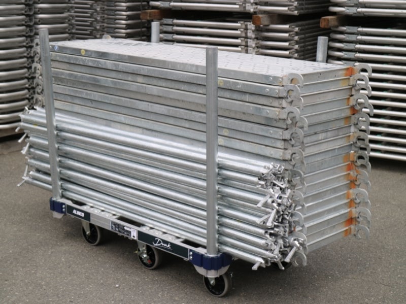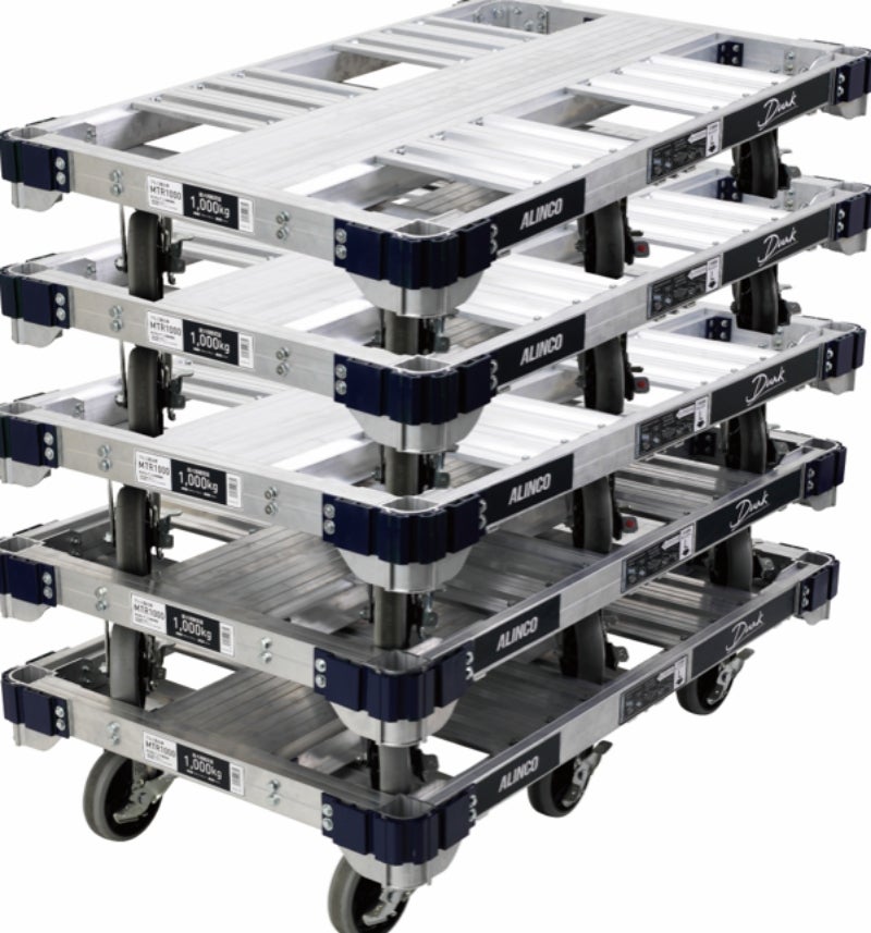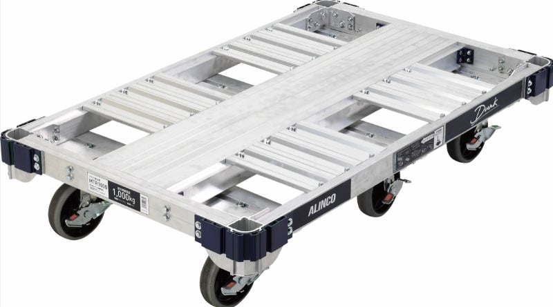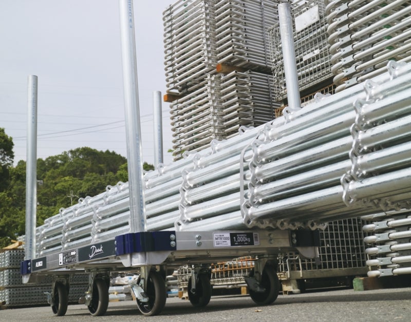 最大1トンの積載を可能にした平床台車。6つのキャスターで楽々移動。建設資材の運搬に最適です