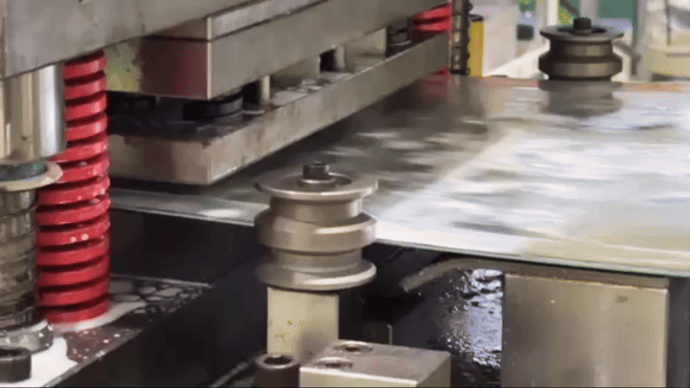 真っ直ぐにした材料にプレス機で滑り止め加工(バーリング加工、エンボス加工)をします。